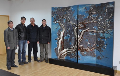 校友捐赠的四折屏风——《枝繁叶茂》是由中国美院教授周崇涨用水彩、蛋壳环保设计完成,同时镶嵌黄金点缀,寓意学校将培养出更多对国家对社会有用的优秀人才,就像画中的大树一样枝繁叶茂。